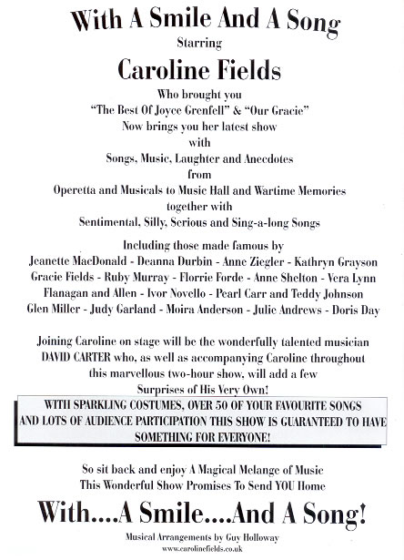 Hiya Everyone Hope you are well - and happy! I'm keeping busy as usual - only wish there were more hours in a day! Good news for Joyce Grenfell fans. Derek Grant of The Derek Grant Organisation has kindly asked if I would revive dear Joyce in "The Best of Joyce Grenfell" and we are to 'bring her back' during the later part of 2007. They already have bookings lined up so look out to see if I am at a Theatre near you. I will keep adding them to this website so check it out occassionally. I have thoroughly enjoyed bringing "Our Gracie" to the stage and have had some wonderful comments. I didn't know there were so many fans of hers out there. I must admit that, when I began to write the script (for those of you who haven't seen it, it is 45% script - her life story - and 55% song) I didn't care much for her, thinking she was a selfish manipulative woman. But, as I was to discover she wasn't like that at all. As I read more and more, reading between the lines, the 'real' Gracie emerged and I found myself totally immersed in her selfless life - and loving her - faults and all! You'll all think I'm mad (I imagine you already suspected that!) but at the last "Our Gracie" show I said something similar to the audience just before starting the song 'Love Is Everywhere' .... that .... "I had grown to love her" and in the middle of the song I felt my voice suddenly change .... soaring into the clouds it seems to gain more power and clarity .... It was as if she was with me! (it was a magical experience and one I shall never forget!). My latest show "With A Smile And A Song" is in rehearsal now so look out for that too. Take a look at the poster if you have time. It is a Musical Melange of .... 'Songs from the shows', 'Wartime Memories', 'Music Hall Stars', 'Cockney Sing-a-longs' etc. Plus a few surprises from David Carter - a very talented and wonderful man! Well, all for now everyone, keep smiling. Love and Blessings to all. Caroline. |